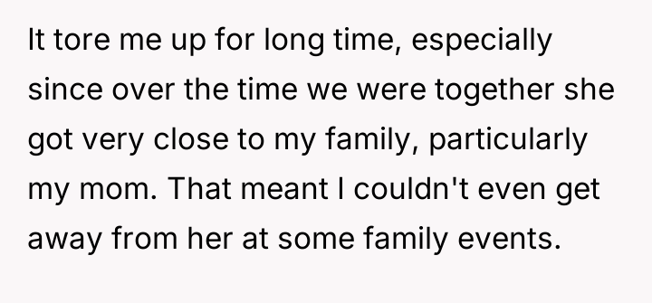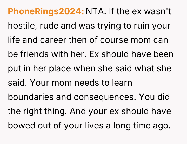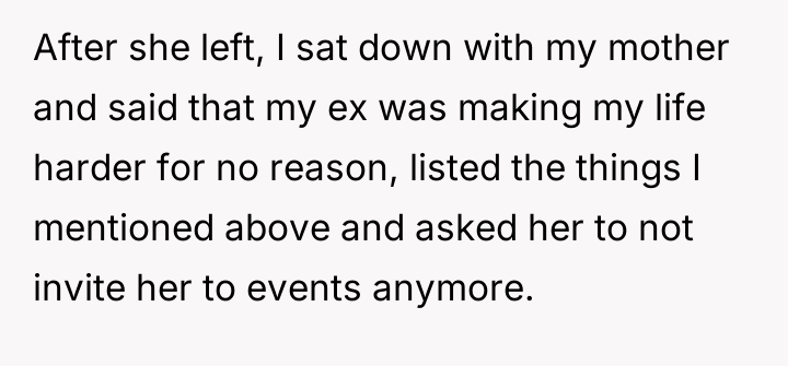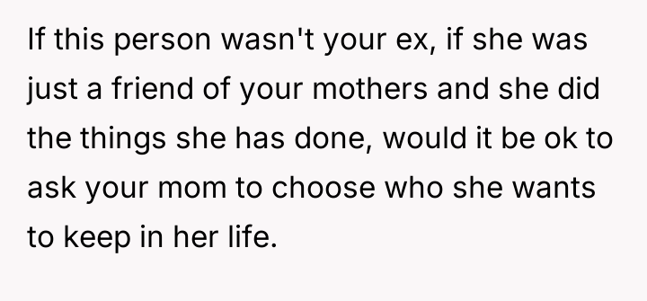 The central conflict arises from the OP prioritizing his immediate family's peace over his mother's established friendship with the ex, leading to an ultimatum that strained the mother-son relationship.