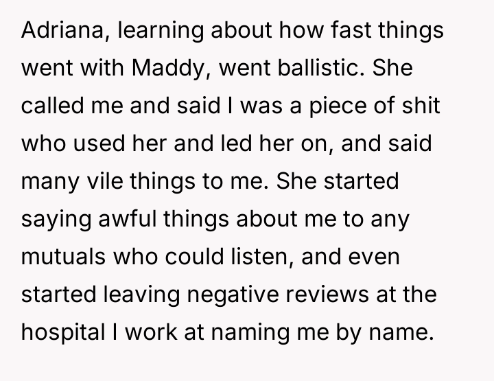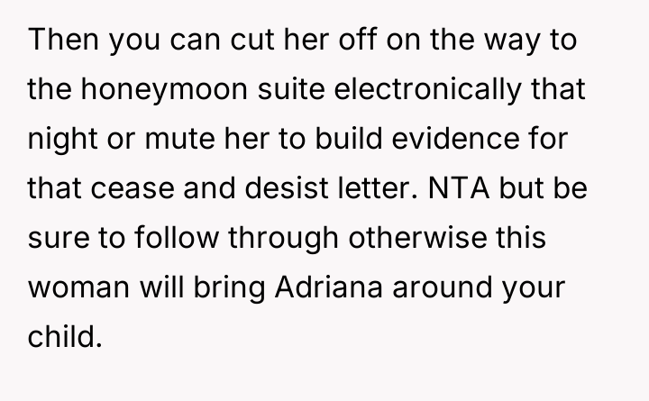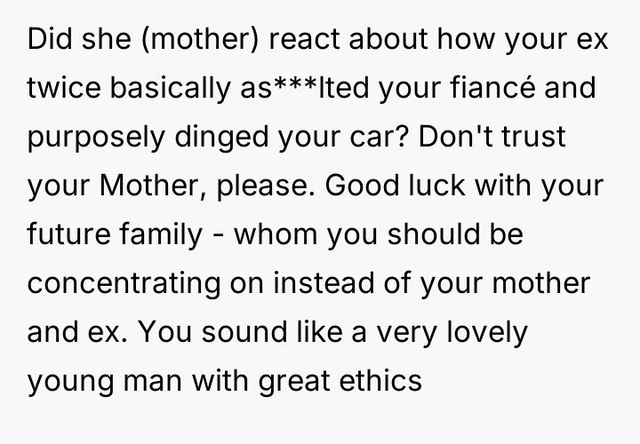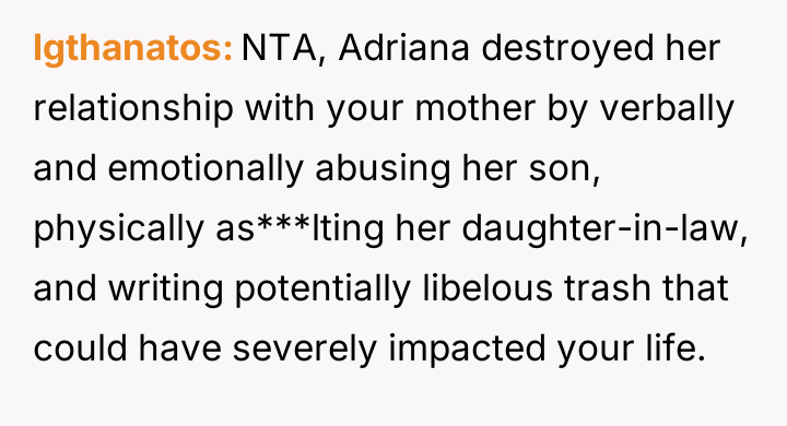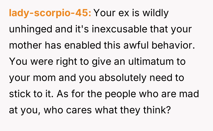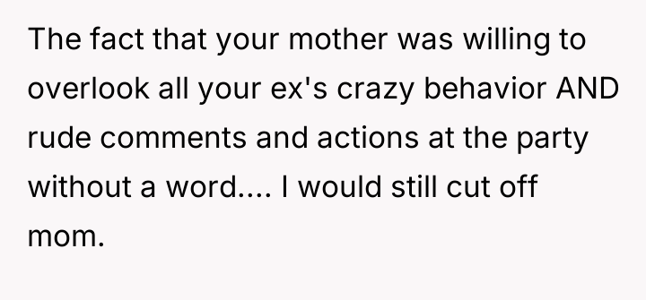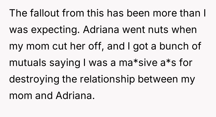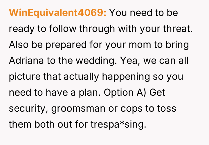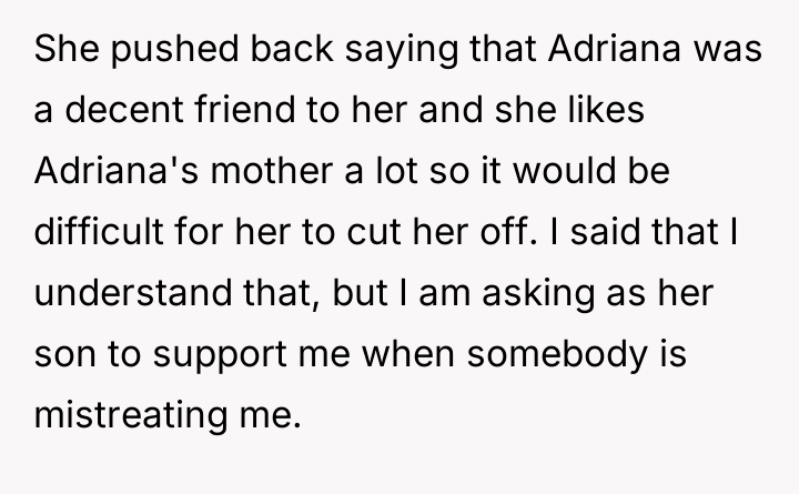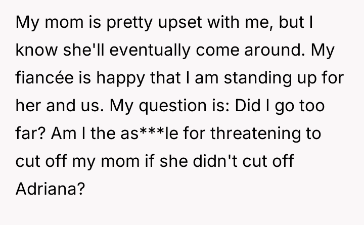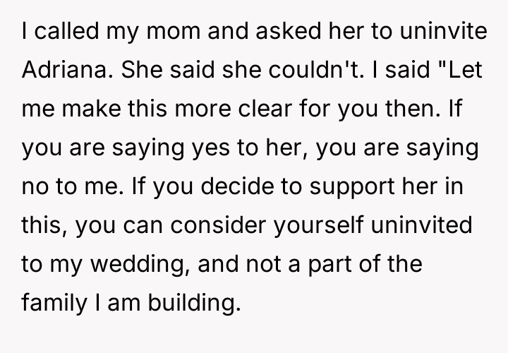 Given the escalating harassment from the ex, including physical actions at a family event, was the OP's ultimatum to his mother—threatening to exclude her from his wedding and future grandchildren if she maintained contact with Adriana—a necessary defense of his boundaries or an overly harsh demand that fractured his existing family ties?