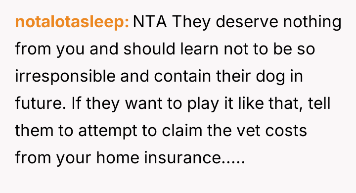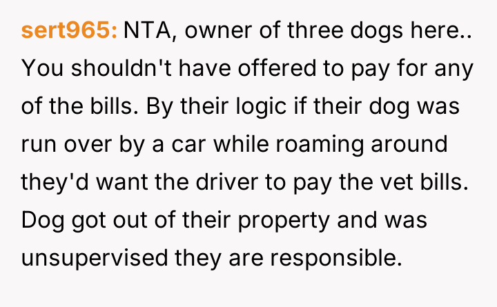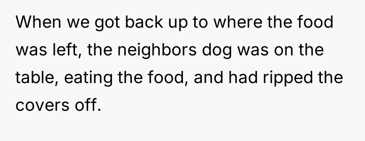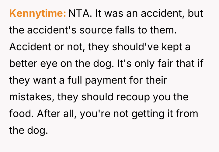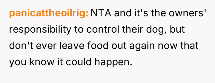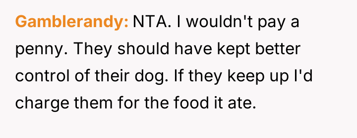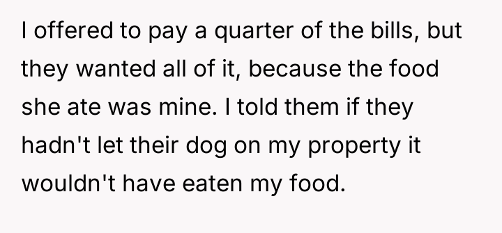 The OP accepted partial responsibility for leaving the food unattended but believes the neighbors are fully liable for failing to control their pet on her property. This creates a standoff where the OP feels unjustly asked to cover 100% of the veterinary costs.