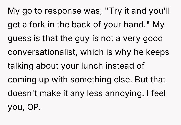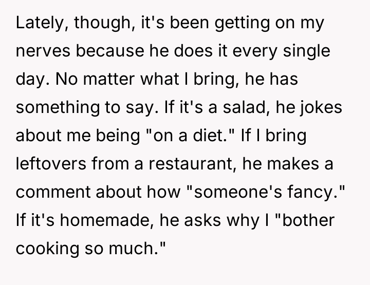 The original poster experienced escalating frustration due to a coworker's persistent, unsolicited comments about their daily lunch choices, leading to a direct confrontation where the boundary was explicitly set.
