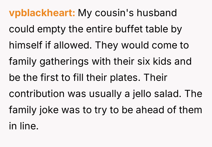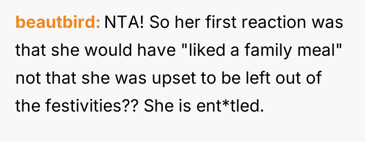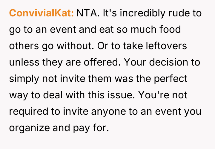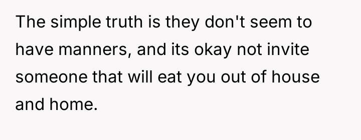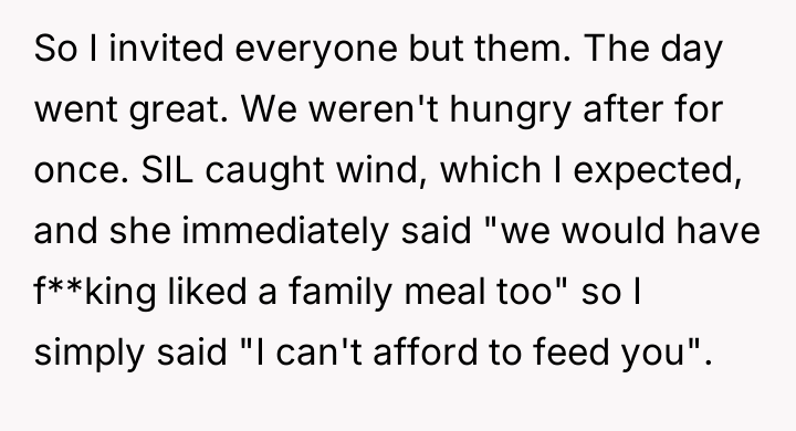 The original poster (OP) experienced significant financial and logistical stress due to their in-laws' excessive food consumption at family gatherings, leading them to exclude the in-laws from this year's event.