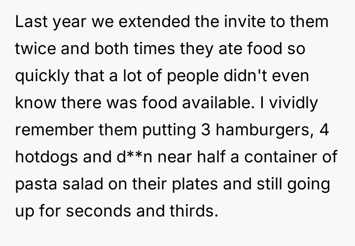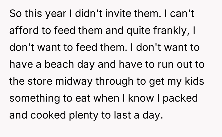 AITA for inviting everyone to the BBQ/beach day except my SIL, her kid and her husband because they eat all the food?