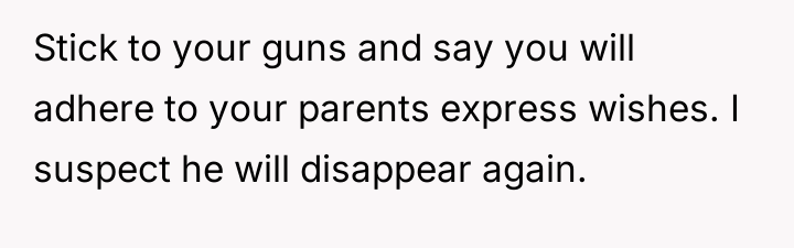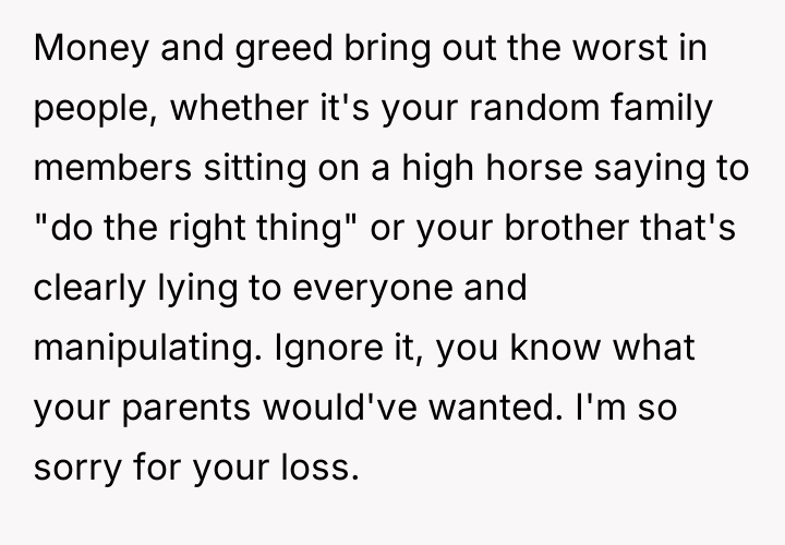 The Original Poster (OP) is facing a difficult situation where grief over her parents' death is compounded by her estranged brother suddenly reappearing solely to claim an inheritance.