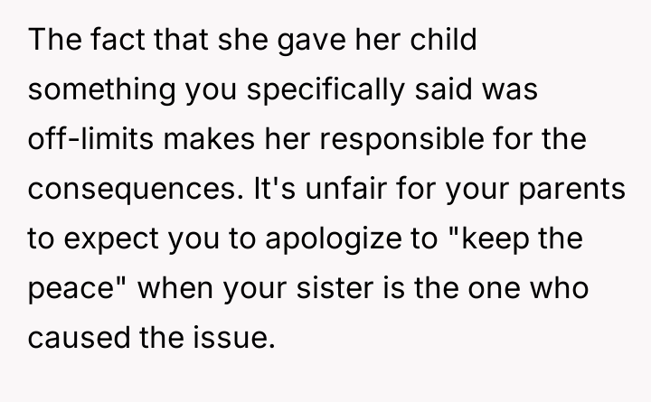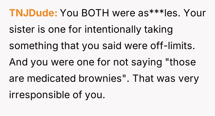 While the sister immediately deflected blame onto the OP for having the edibles present, the OP maintains that their primary fault lies in setting an absolute rule that was then intentionally violated by the sister for convenience.