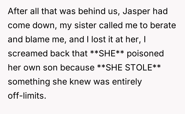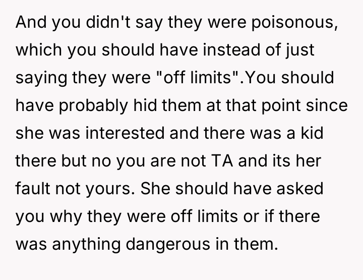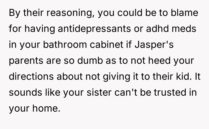The core debate centers on whether the responsibility for the child's poisoning rests solely with the adult who willfully disregarded a clear prohibition (the sister), or if the homeowner (the OP) bears a secondary responsibility for keeping substances in their private residence, even without prior notice of a child's visit.