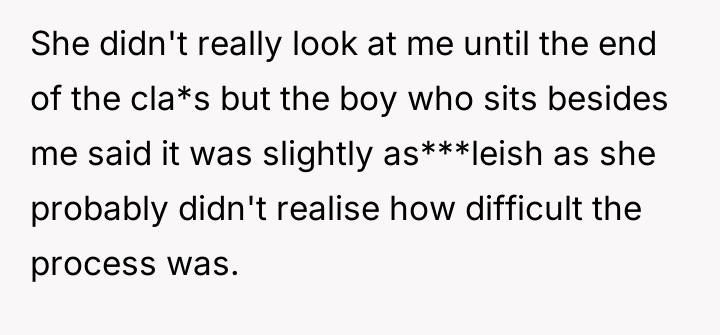 Her English teacher’s harsh words cut deeper than the noise of the old chair, dismissing her strength and attachment as mere distractions.