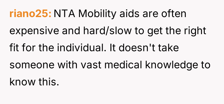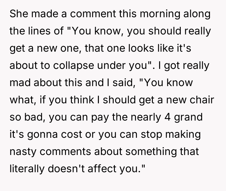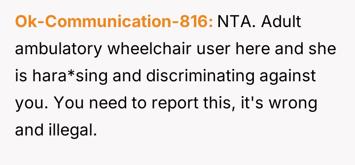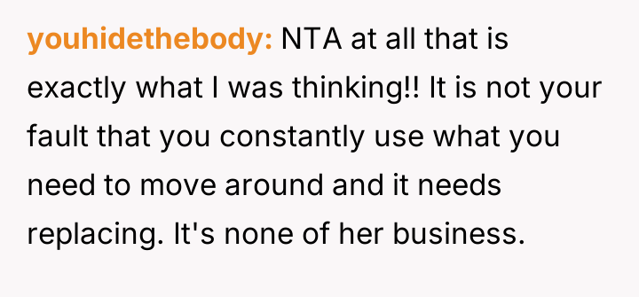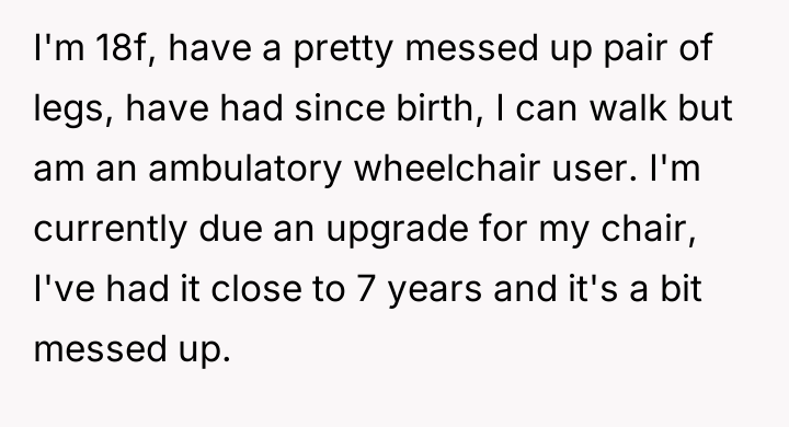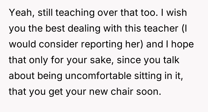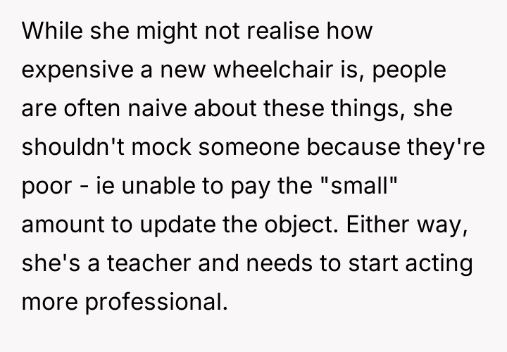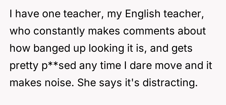 The original poster (OP) is facing a conflict stemming from a teacher's repeated, critical comments about her well-used mobility aid, which the OP finds hurtful and intrusive.