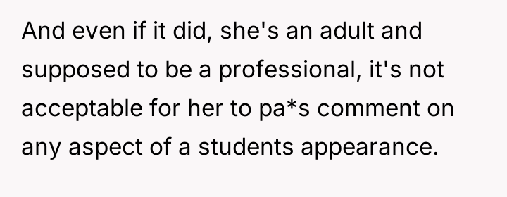 The OP reacted strongly by demanding the teacher either fund the expensive replacement or cease the criticism, highlighting the disconnect between the teacher's casual judgment and the OP's practical, financial, and emotional reality regarding her necessary equipment.