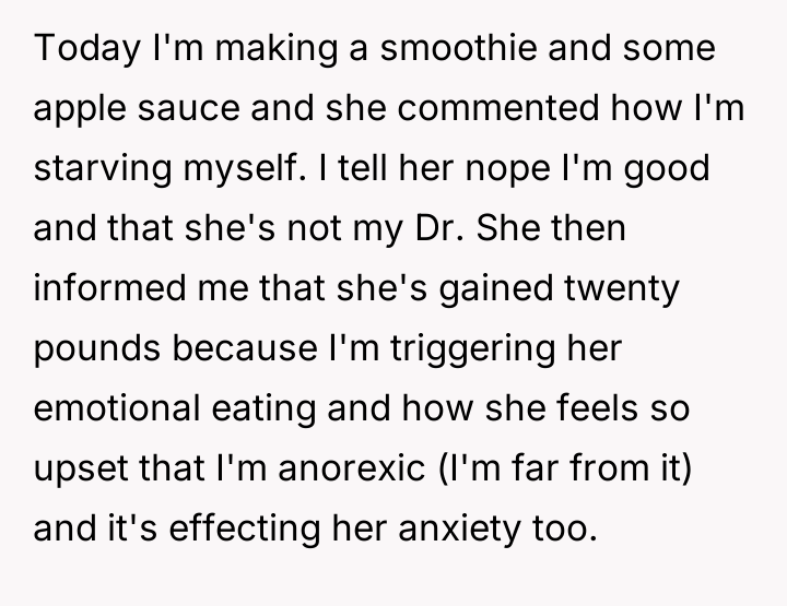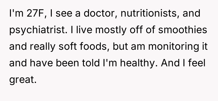 The original poster (OP) is facing a conflict where their established, medically supervised dietary choices are being challenged by their roommate's partner, who claims the OP's eating habits trigger her own emotional eating issues.