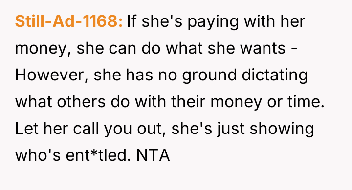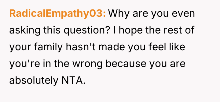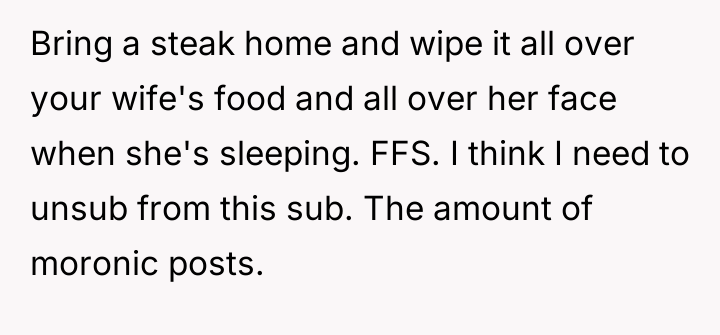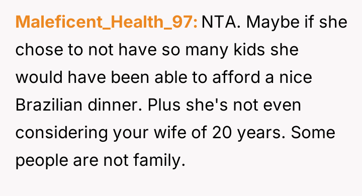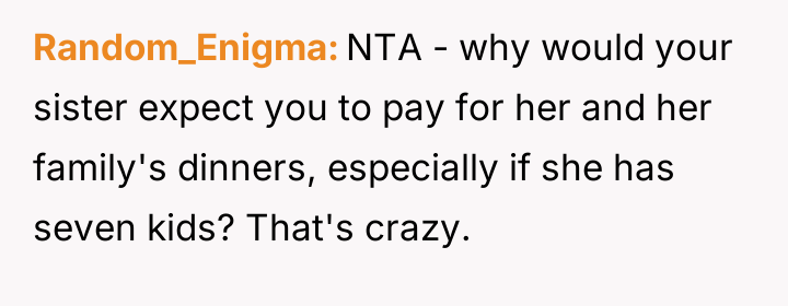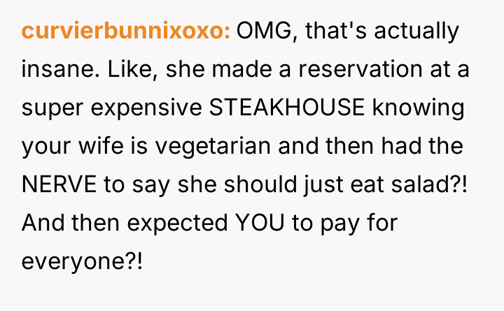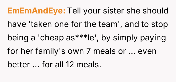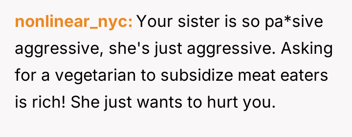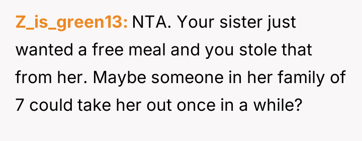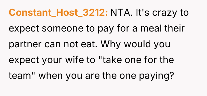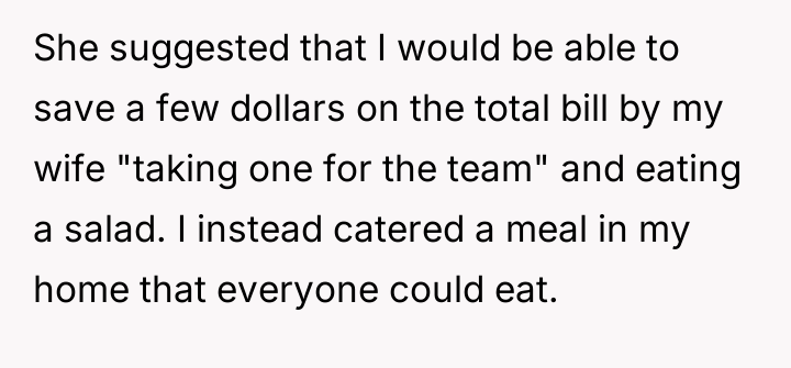 The sister dismissed this concern, suggesting the wife should just eat a salad to 'take one for the team' and save the OP a small amount.