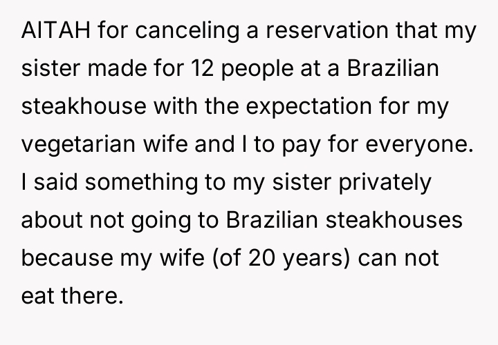 AITAH for canceling a reservation that my sister made for 12 people at an expense steakhouse with the expectation for my vegetarian wife and I to pay for everyone.