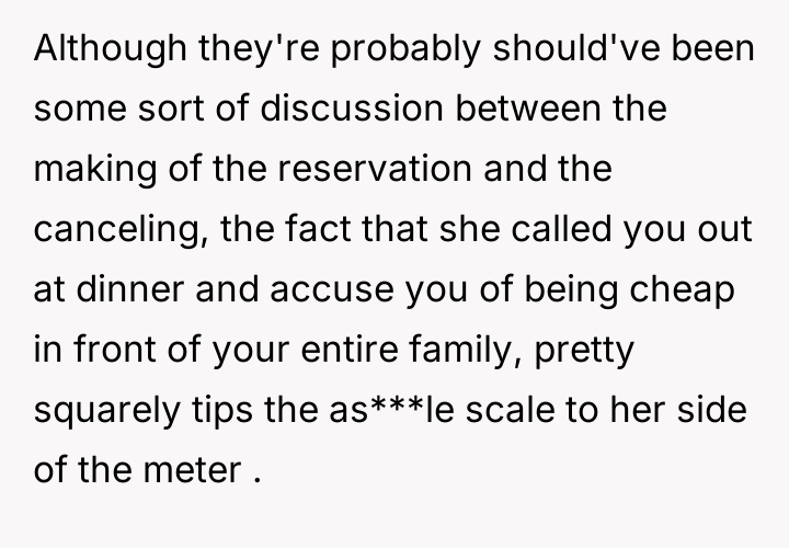 The core question is whether the OP was justified in canceling the reservation and arranging an alternative meal when faced with a potentially expensive outing that excluded his wife and demanded he pay for others, or if this response was an overreaction to the sister's poor suggestion.