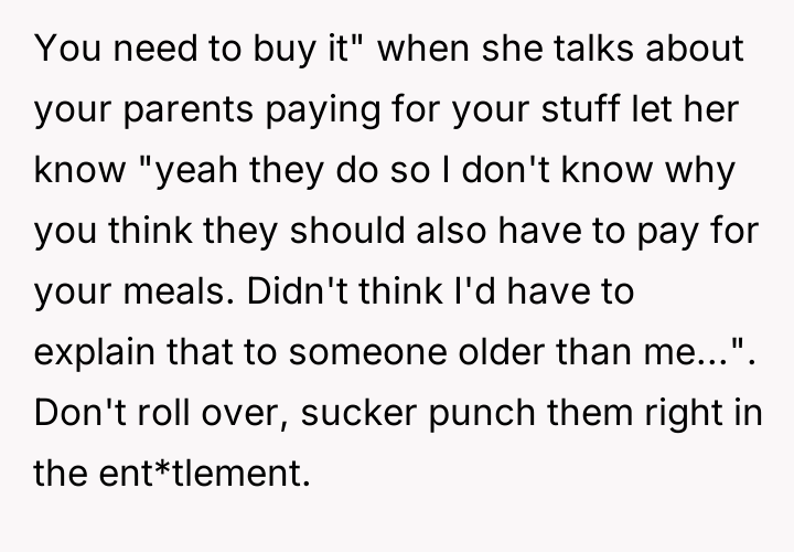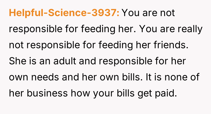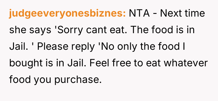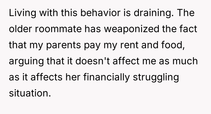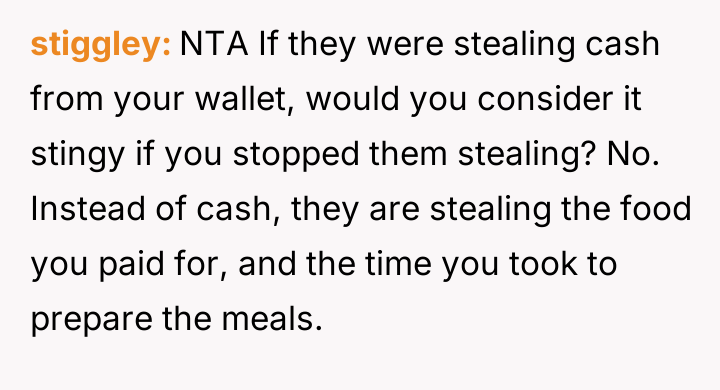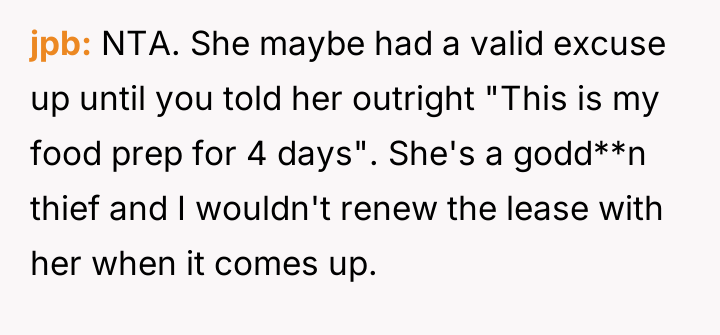 The original poster (OP) experienced repeated theft of their pre-prepared meals by an older roommate who rationalized the actions based on the OP's financial support and the perceived need to prevent food waste.