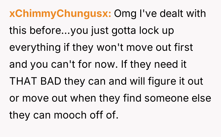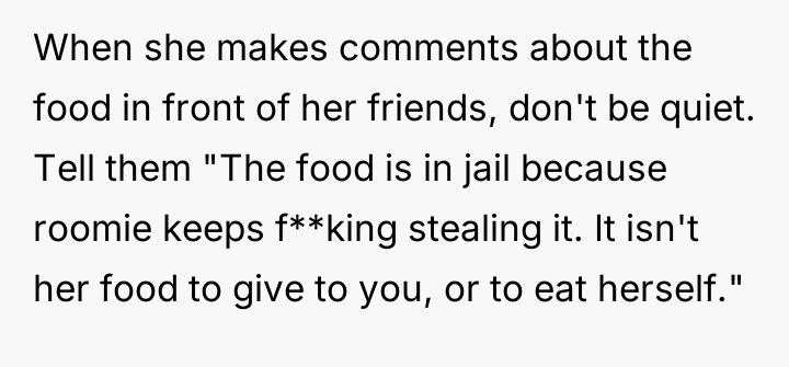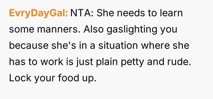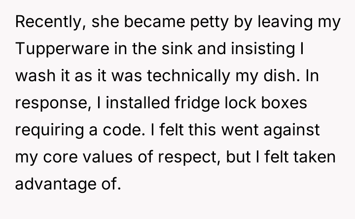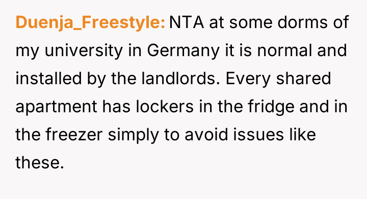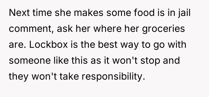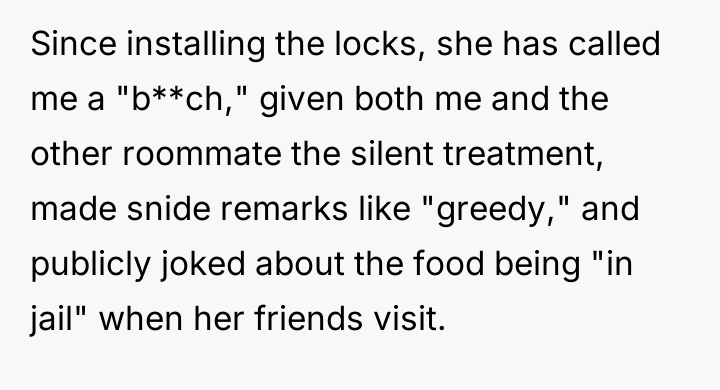 This culminated in the OP installing personal food locks out of necessity, leading to severe retaliatory behavior, including insults and social exclusion from the roommate.