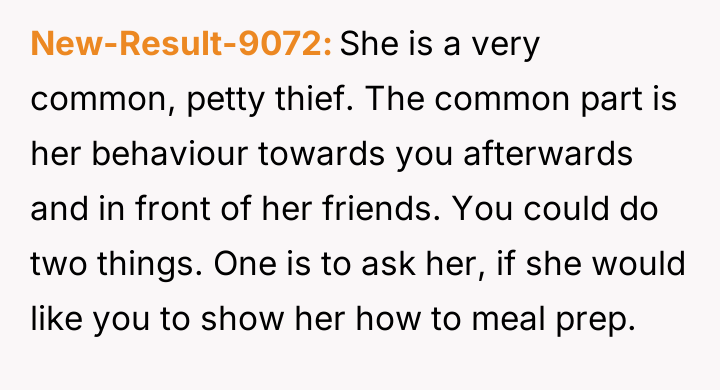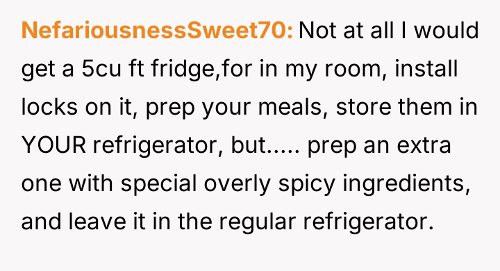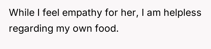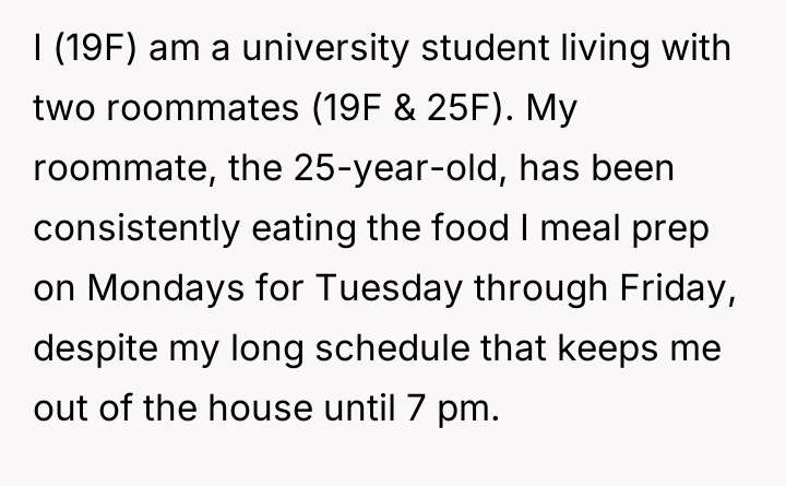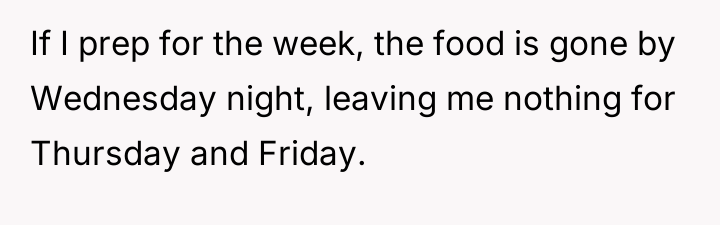 Each Monday, she invests time and effort into meal prepping for her grueling week ahead, only to return to an empty fridge by midweek, her hard work consumed without consent or consideration.