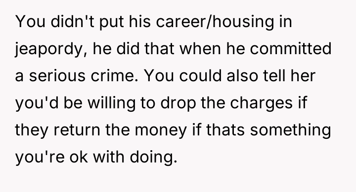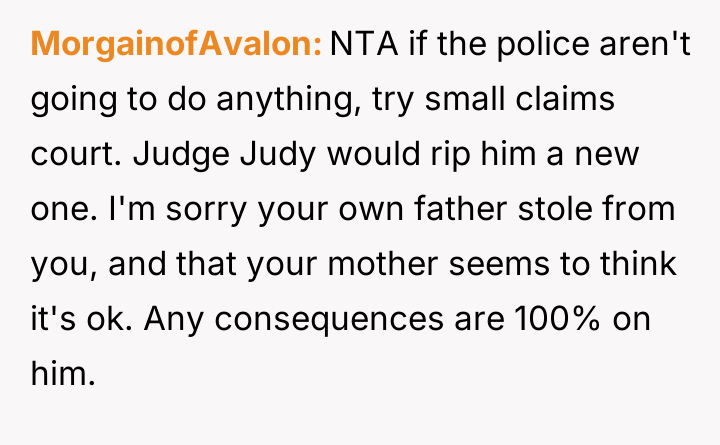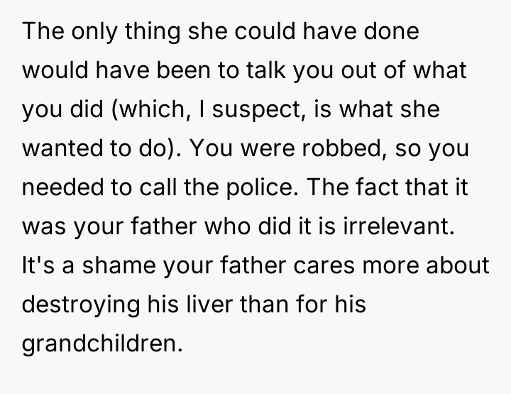 Was the OP justified in prioritizing the recovery of her son's funds and holding her father accountable through legal channels immediately, or should she have first consulted her mother to attempt an informal resolution, given the potential devastating impact a theft charge could have on her parents' lives?