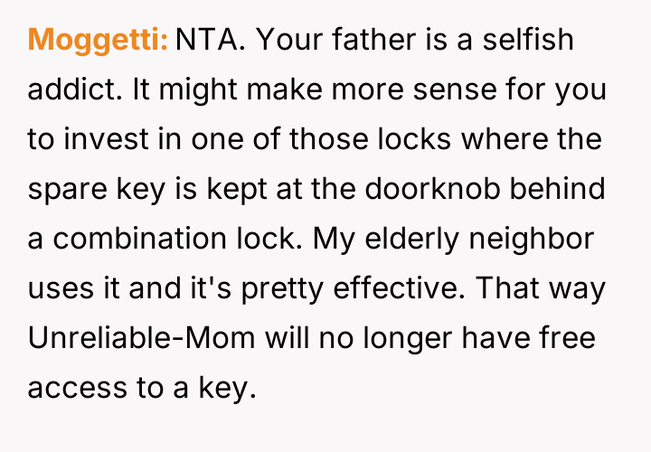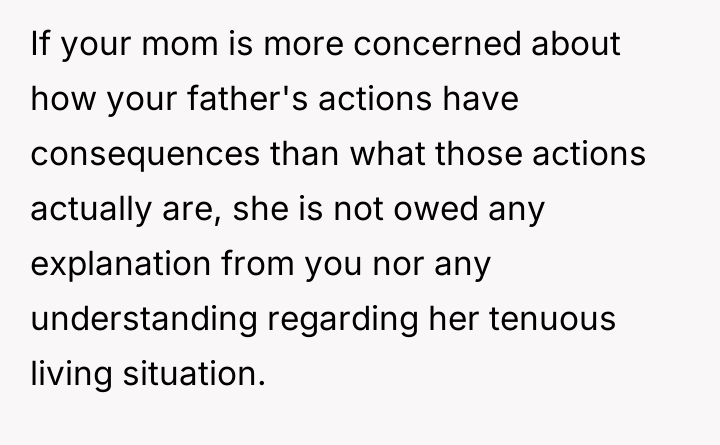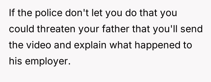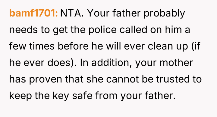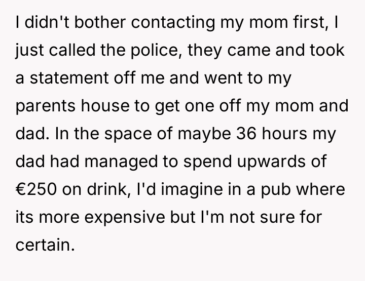 Her decision to immediately involve the police stemmed from past trauma related to her father's financial irresponsibility and addiction, conflicting sharply with her mother's desire to protect the father from legal and housing consequences.