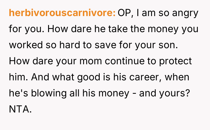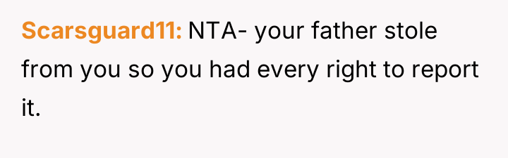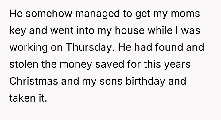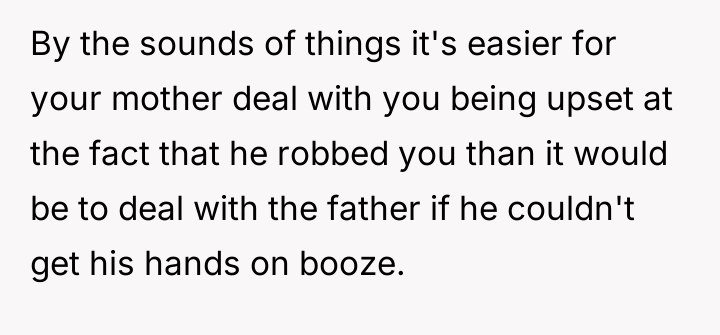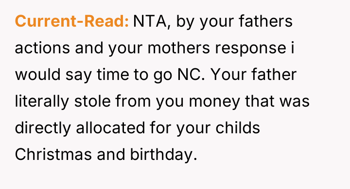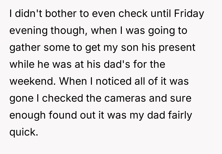The original poster (OP) is dealing with the severe emotional impact of her father stealing essential savings intended for her son's birthday and Christmas.