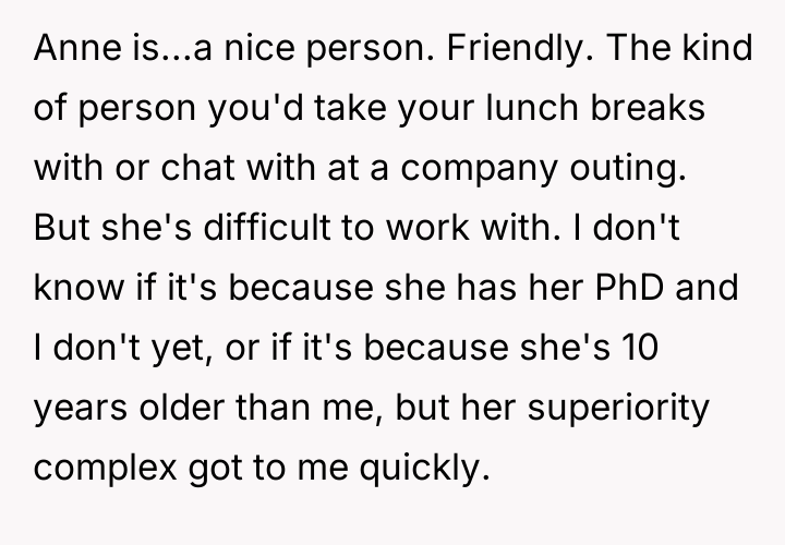 Then came Anne, a seasoned postdoctoral associate whose friendly demeanor masked the challenging undercurrents of their collaboration.