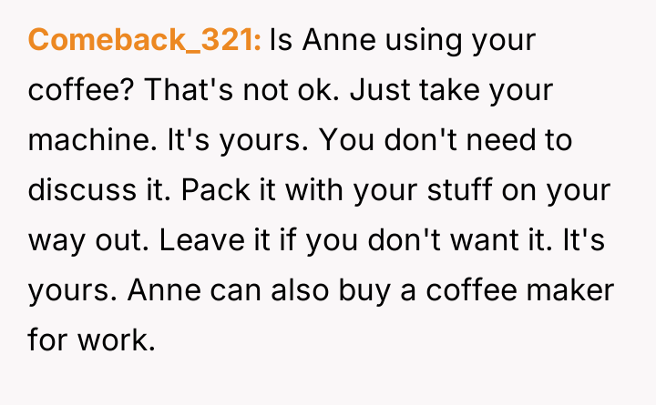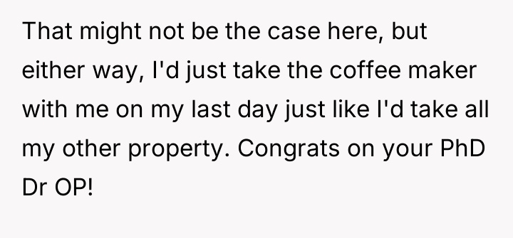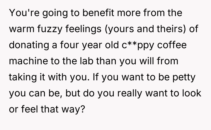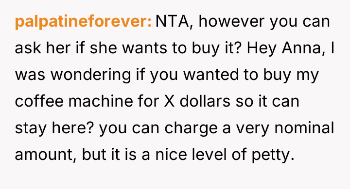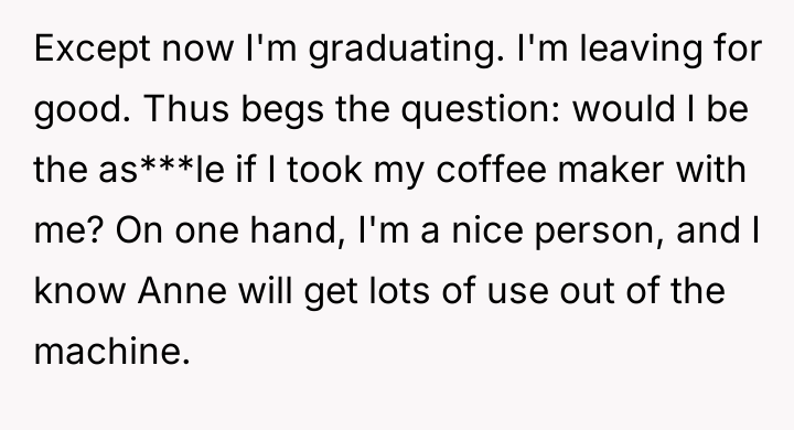 The original poster (OP) is facing a dilemma regarding whether to take a personal, older coffee maker upon leaving their PhD program, especially since a difficult colleague, Anne, has become dependent on it.
