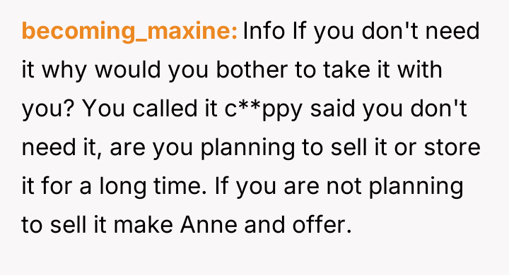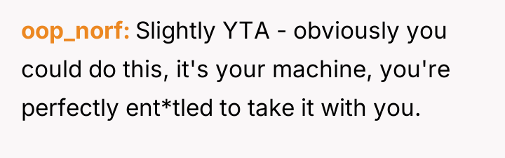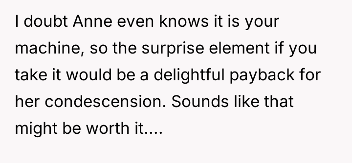 If the OP takes the machine, they prioritize their own comfort and slight retribution for past frustrations; if they leave it, they act graciously despite Anne's negative contributions.