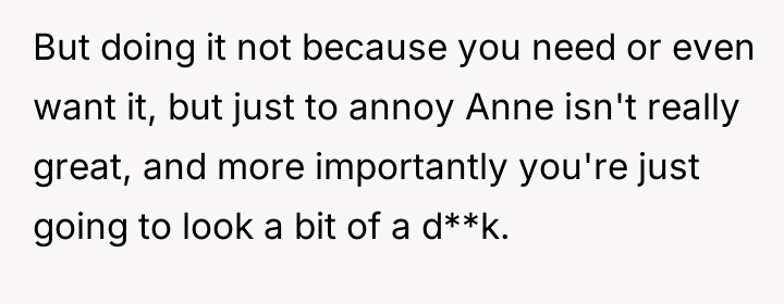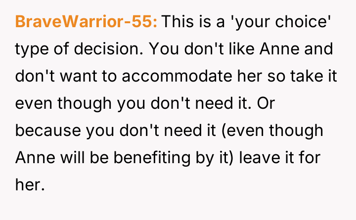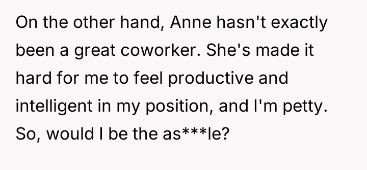 The conflict centers on the OP's desire to be generous versus a feeling of resentment stemming from Anne's challenging workplace behavior and perceived lack of respect.