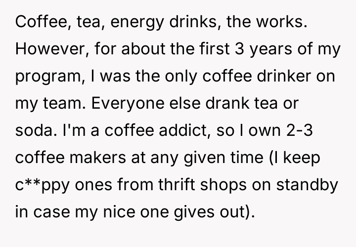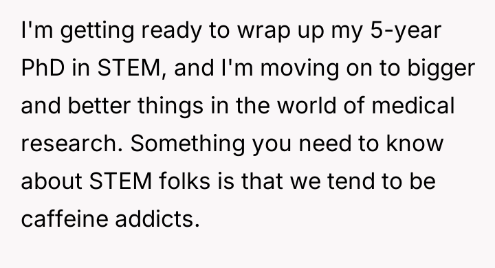 For five relentless years, a solitary coffee addict navigated the demanding world of STEM, clinging to the comfort of her trusty, secondhand coffee makers while surrounded by tea and soda drinkers.