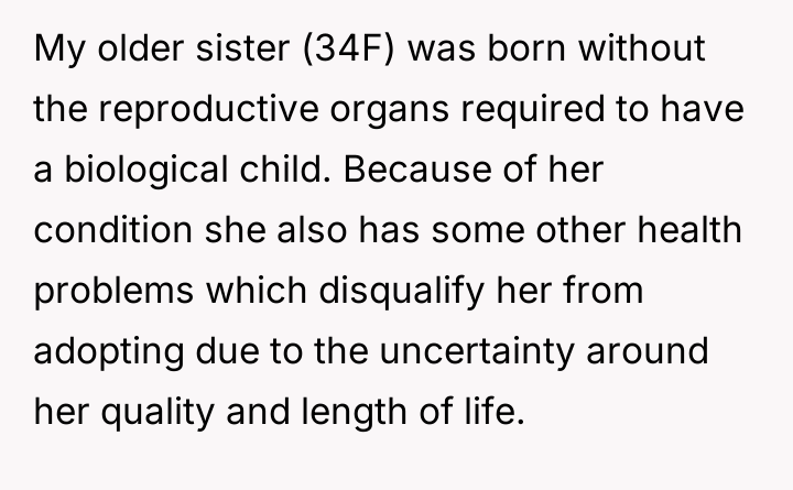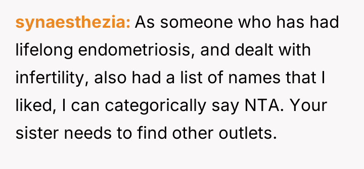 The original poster (OP) is facing a difficult situation where their sister, who cannot have children due to medical reasons, strongly desires a significant role in naming the OP's first baby.