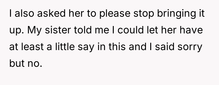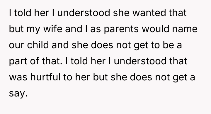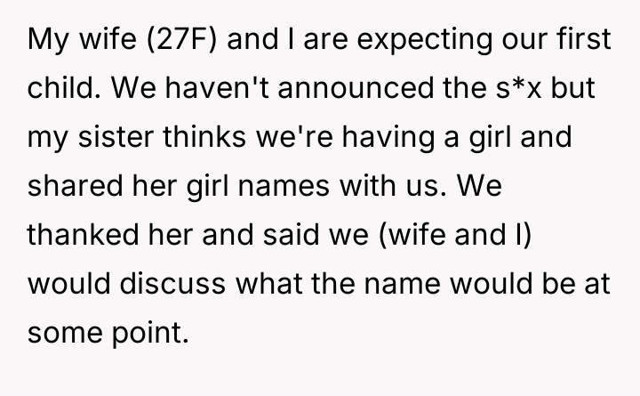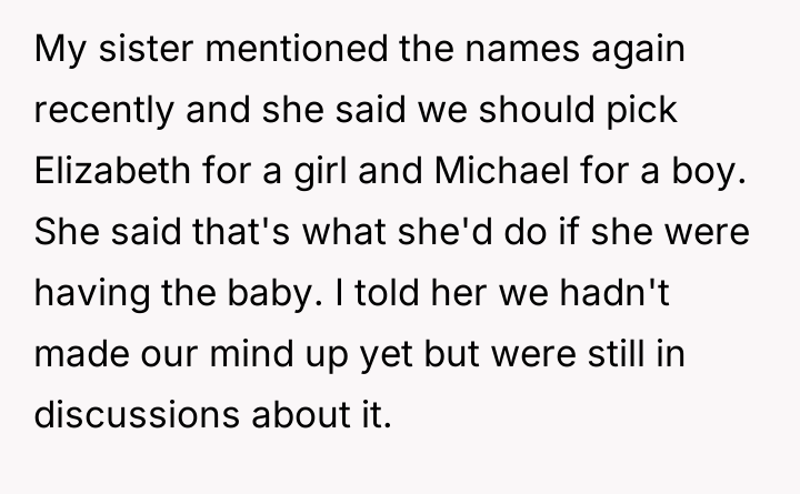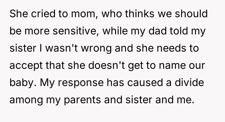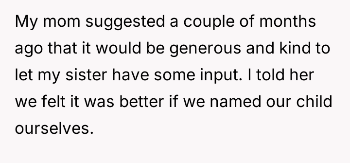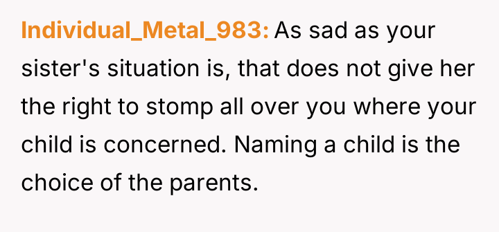The central conflict arises from the OP and his wife's desire to maintain full autonomy over naming their child, which directly clashes with the sister's deeply felt, unmet longing for motherhood, leading to emotional distress for the sister and accusations of lacking compassion from the mother.