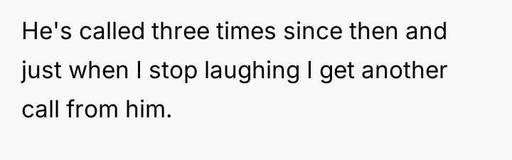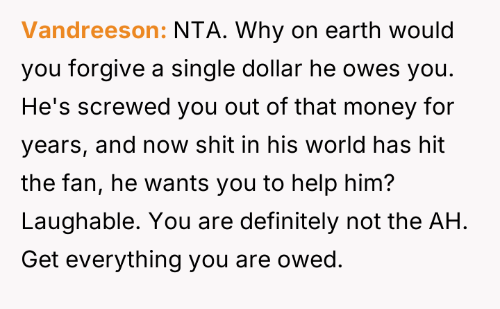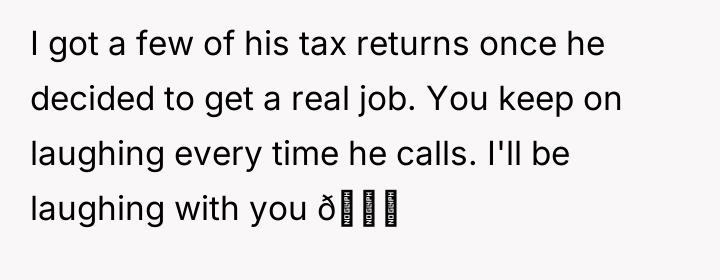 The poster feels justified in laughing at his predicament, given his long history of parental abandonment and financial evasion.