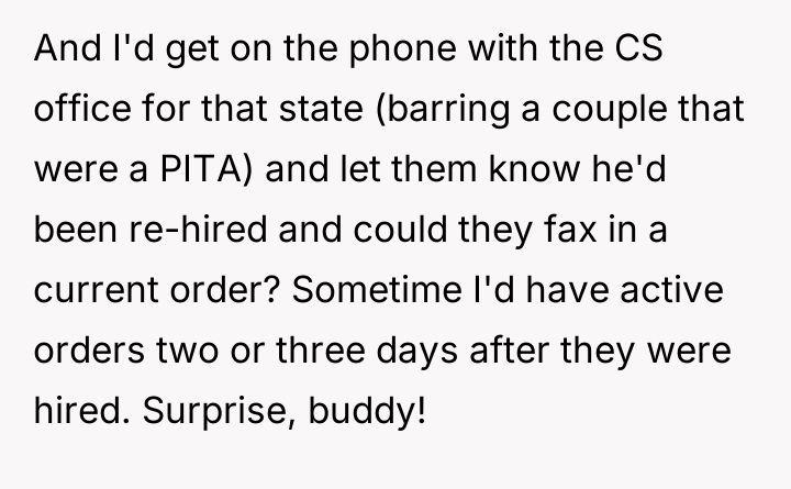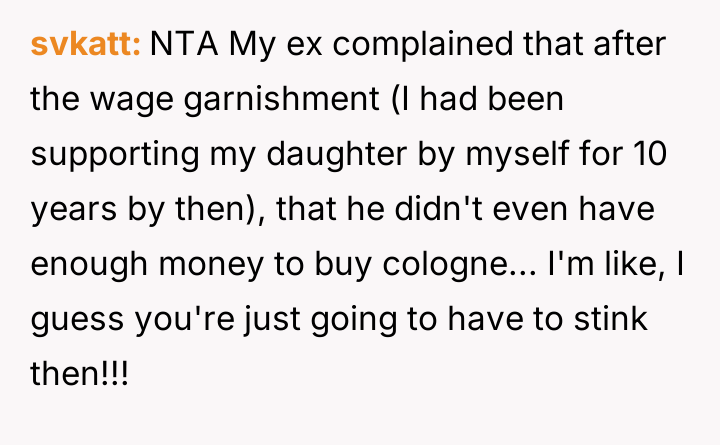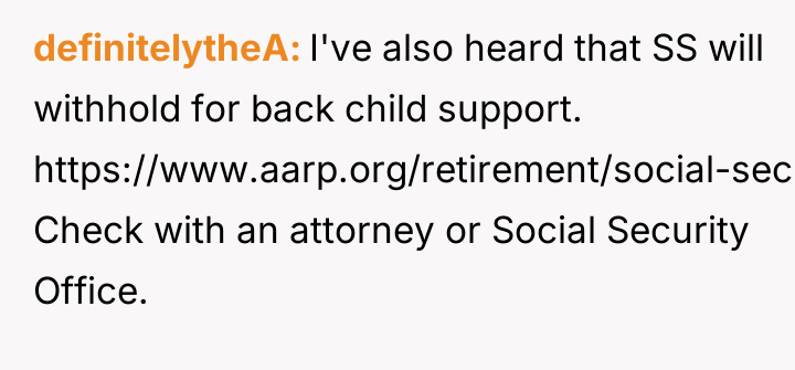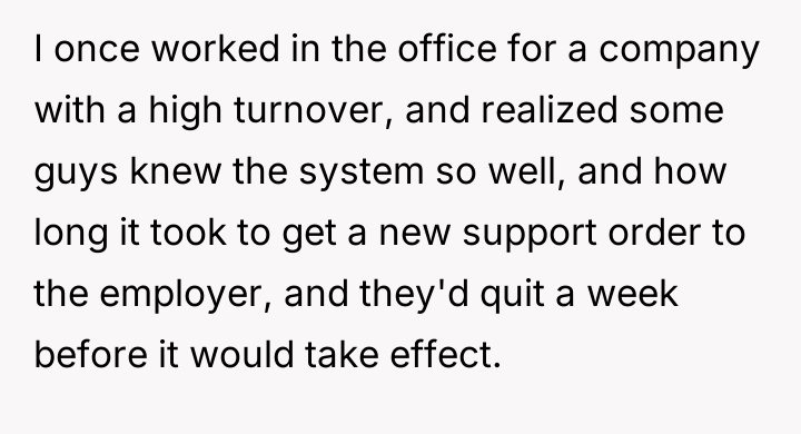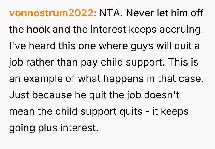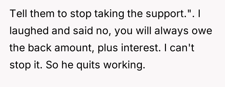When the ex-husband called to stop the payments, the poster informed him he was still responsible for the accumulated back support and interest. He responded by quitting his job to avoid the garnishment.