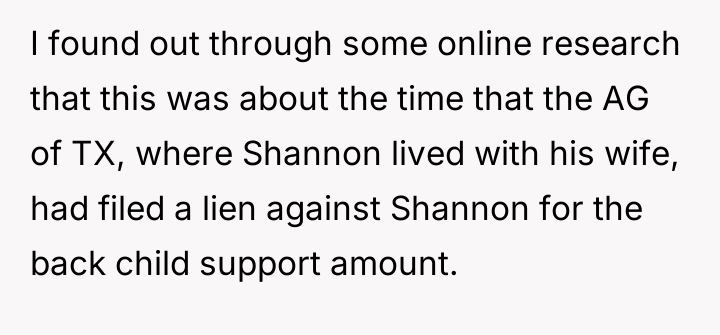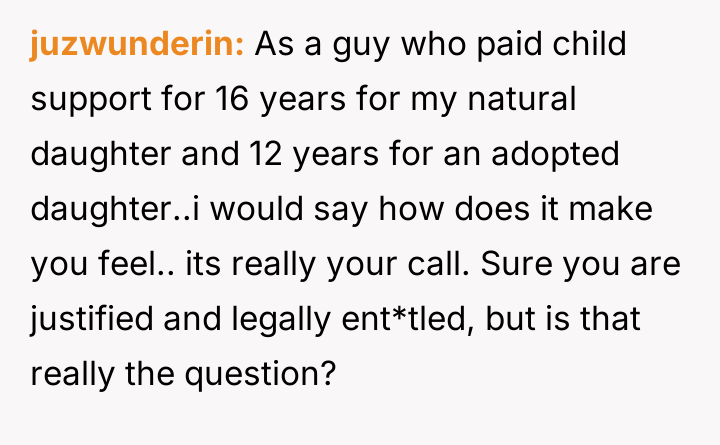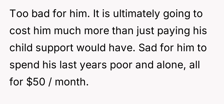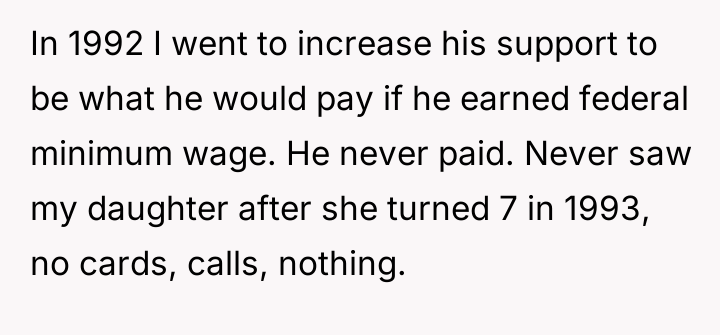 The poster later sought to increase the support amount based on federal minimum wage, but the ex-husband continued to pay nothing and stopped having contact with their daughter after she turned seven in 1993.