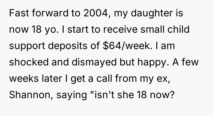 Years later, in 2004 when the daughter turned 18, support payments of $64 per week suddenly began being deposited.