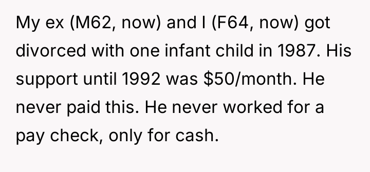 The poster, now 64, divorced her husband (now 62) in 1987 when they had an infant child. From 1987 until 1992, the ex-husband provided no child support, despite the court order.