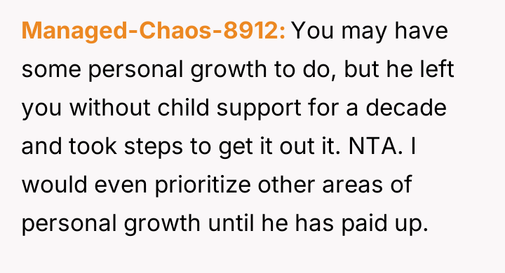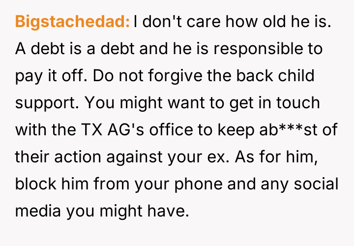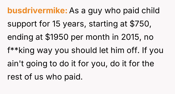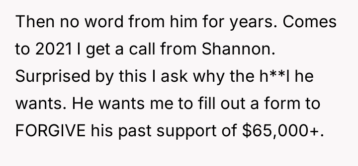 Decades later, in 2021, he contacted the poster asking her to forgive over $65,000 in accumulated back support, promising to pay $300 monthly directly if she did so, leading the poster to question her reaction to this request.
