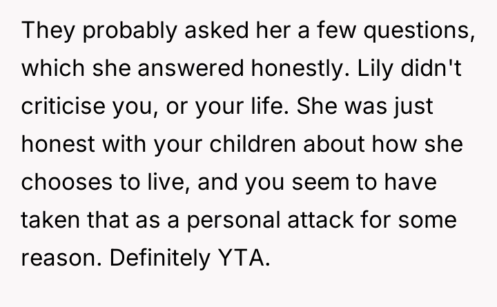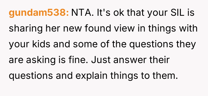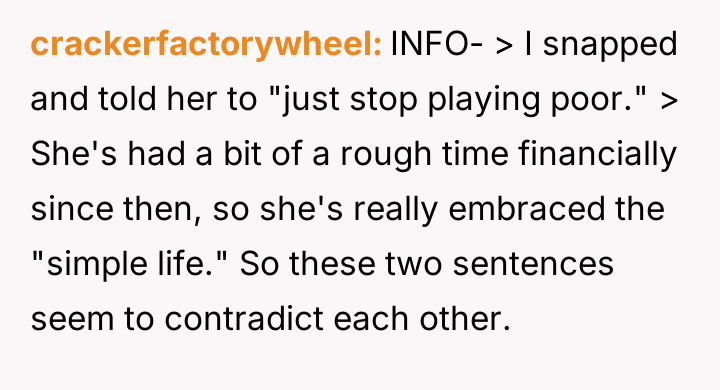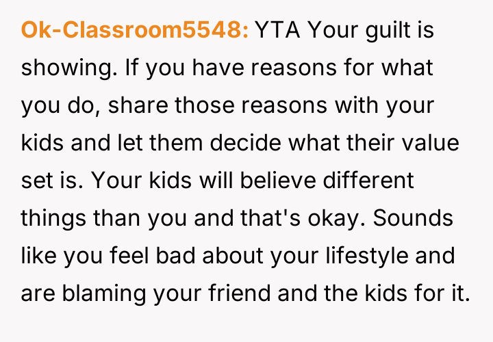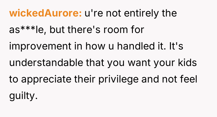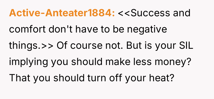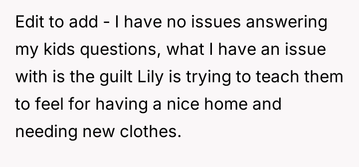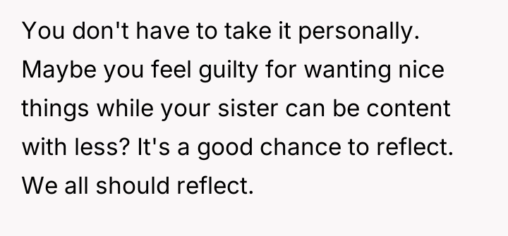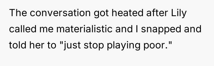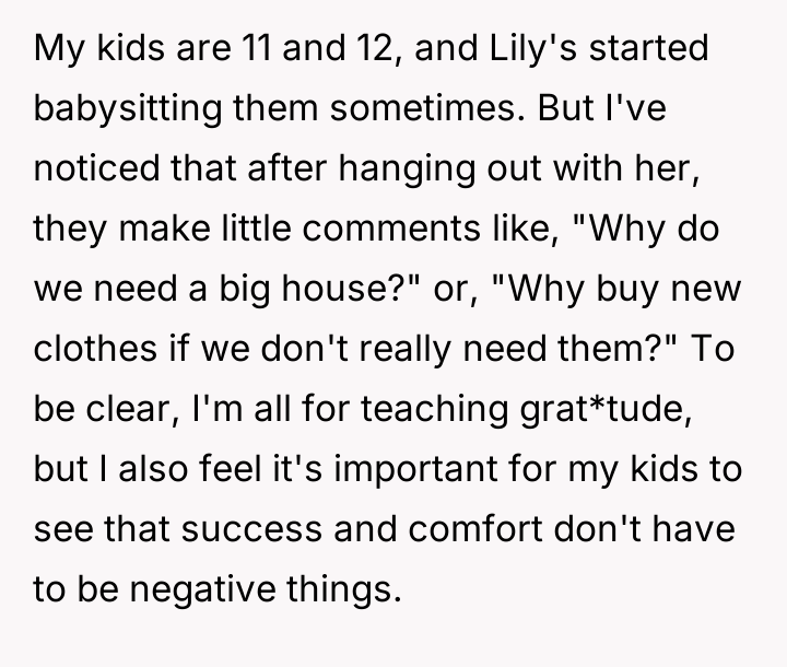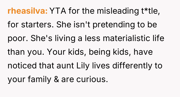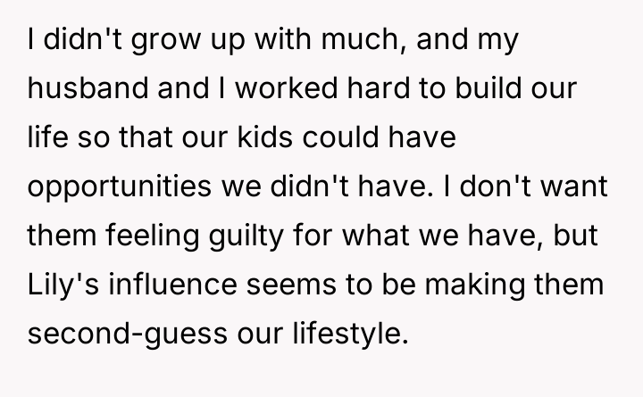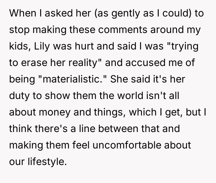 The OP feels the need to defend their hard-earned success and prevent feelings of guilt in their children, leading to an argument where the OP told the sister-in-law to stop 'playing poor.' Is the OP justified in setting boundaries to protect their children's perception of their own life, or is the sister-in-law correct that she is simply sharing valid, contrasting life values, making the OP overly sensitive to differing viewpoints? Where is the appropriate line drawn between teaching gratitude and instilling guilt?