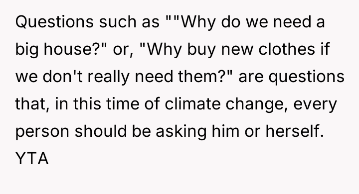The original poster (OP) is struggling with a conflict where their sister-in-law's strong anti-materialistic stance is influencing the OP's children to question their family's comfortable lifestyle.