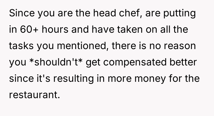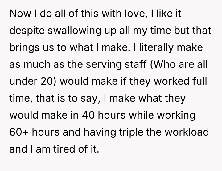 The original poster (OP) is deeply invested in the family restaurant, having significantly improved its performance through hard work and innovation, yet they are severely undercompensated, earning wages comparable to entry-level staff despite working 60+ hours a week.