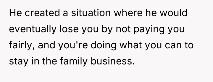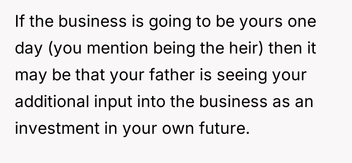 Should the father prioritize immediate cash flow by fairly compensating the heir apparent, or is the OP's expectation of higher wages premature while the business succession is still technically unresolved?