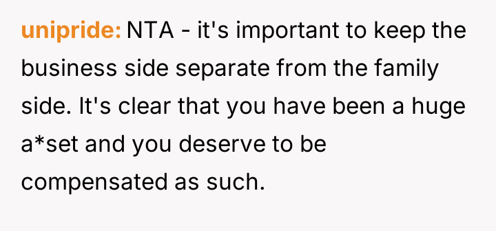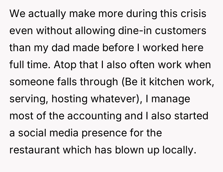 Given the OP's documented success in tripling revenue and assuming massive responsibility, was the ultimatum to seek double pay elsewhere a reasonable defense of their professional worth, or did it unfairly pressure the family dynamic?