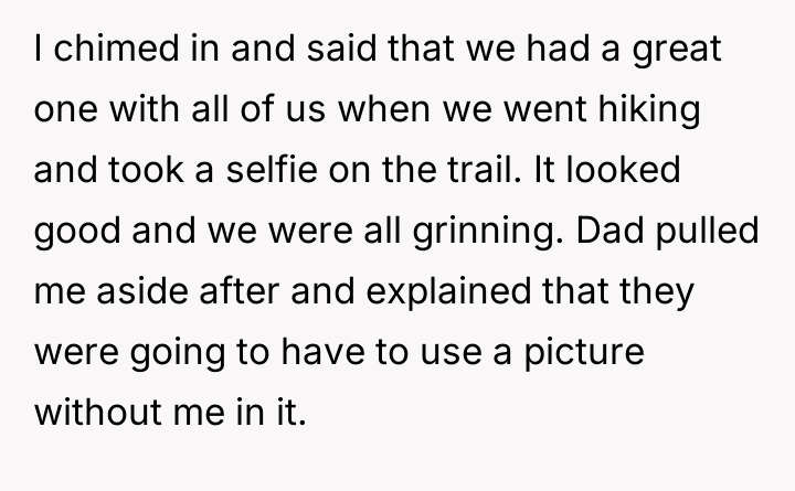Her action of submitting a photo including herself forced a confrontation with the central conflict: her father's desire to maintain a specific, curated image versus her inherent right to be acknowledged as his daughter.