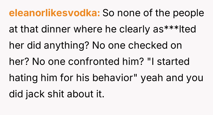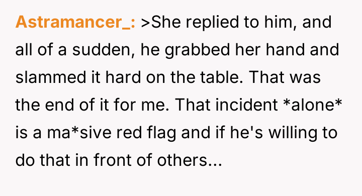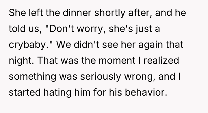 A specific incident occurred during a group dinner where the friend grabbed his wife's hand and slammed it on the table after she replied to something he said; she left shortly after, and he dismissed her distress by calling her a 'crybaby.' This incident led the narrator to recognize a serious problem and develop a strong negative feeling toward his friend.