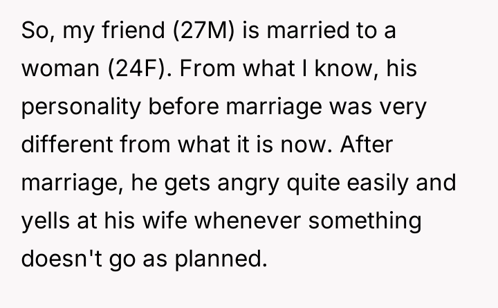 Before marriage, the friend was different, but afterward, he began to express anger easily, frequently yelling at his wife, even in front of family and friends when plans changed.