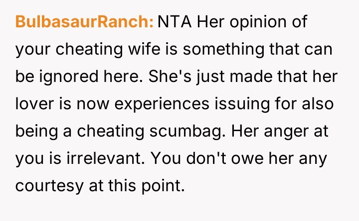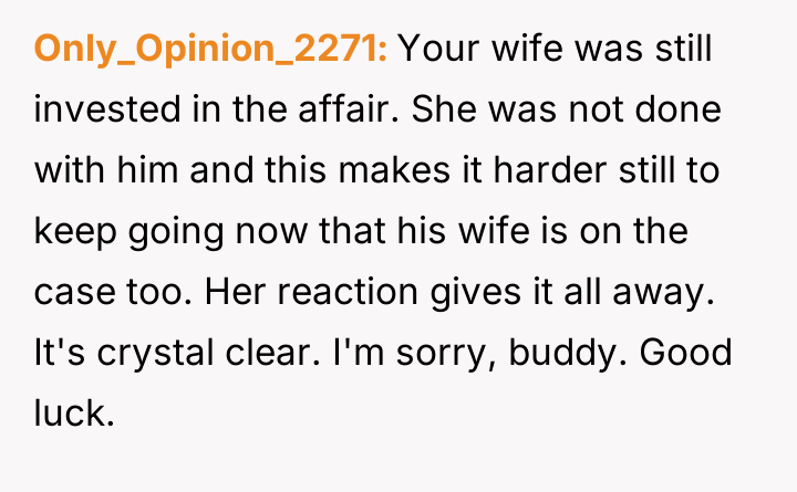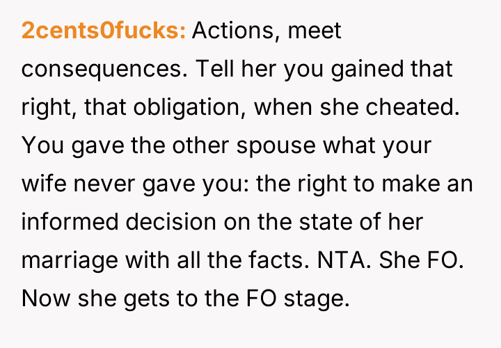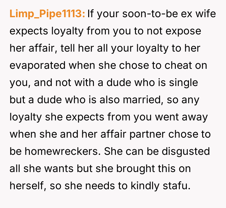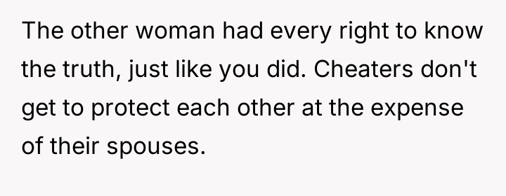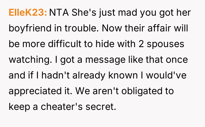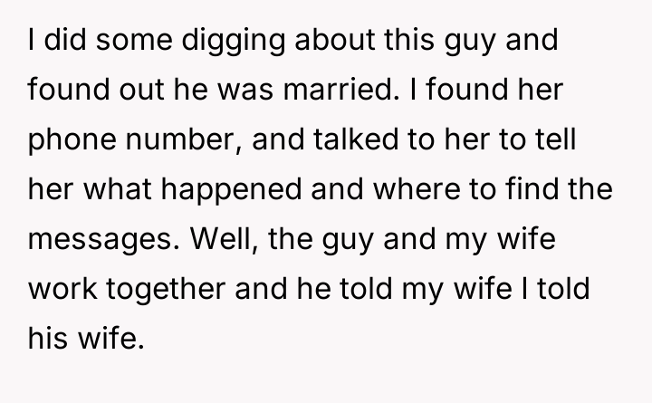 Given the breakdown of trust and the conflicting actions taken by both parties, the central question remains: Was the OP justified in exposing the affair to the other man's wife as a means of addressing the marital betrayal, or did this action overstep personal boundaries and escalate a private conflict inappropriately?
