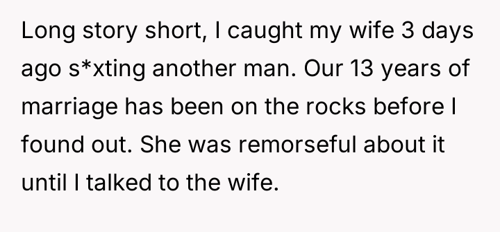 Betrayal cut deep when he discovered his wife of thirteen years secretly sexting another man, shattering the fragile trust they had left.