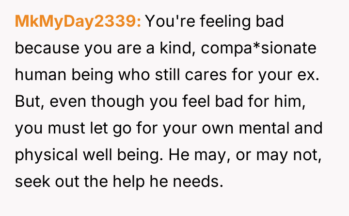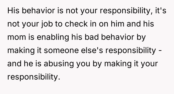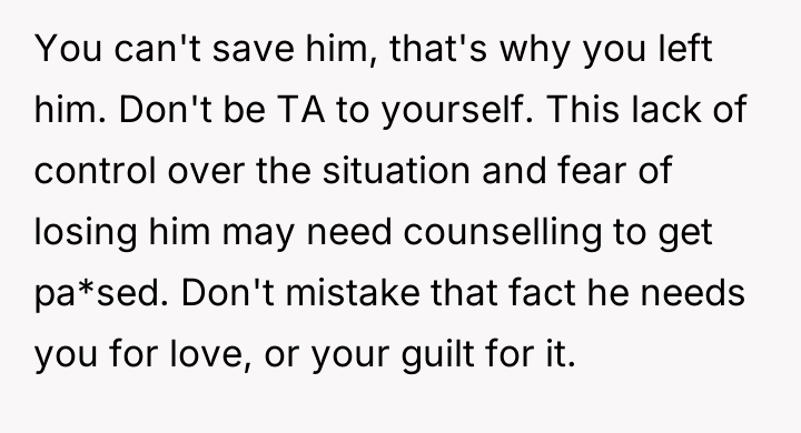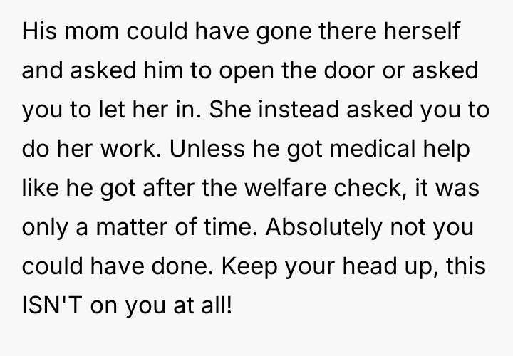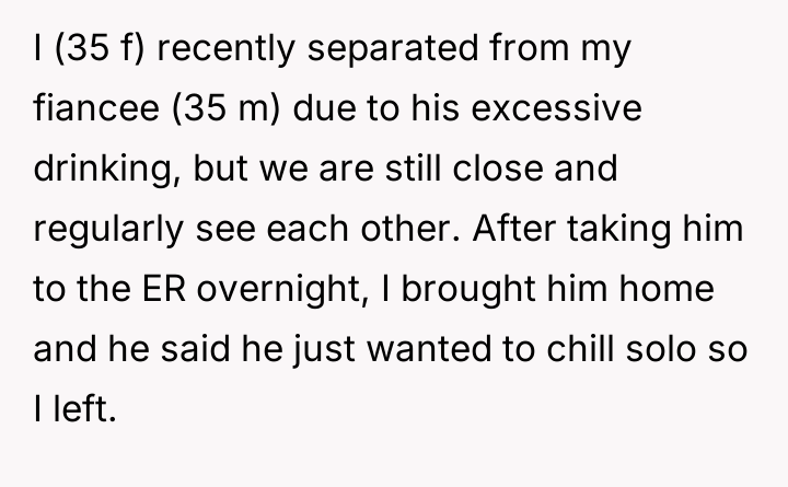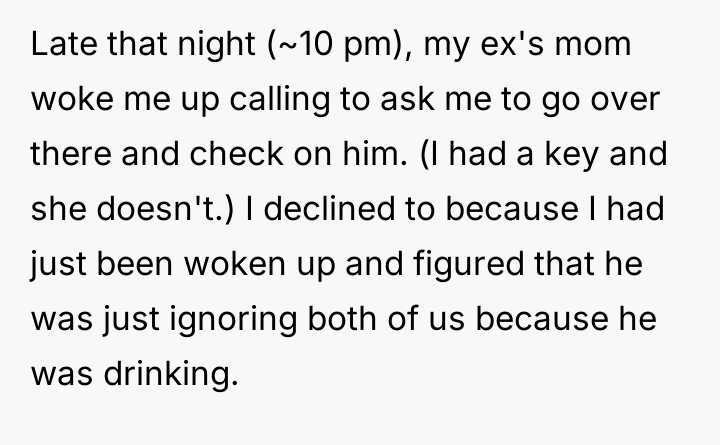 The original poster is grappling with intense guilt after refusing to check on their recently separated, heavily drinking ex-fiancen and subsequently leading to his mother calling for a welfare check.