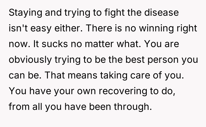 The core conflict lies between the poster's understandable burnout, need for personal boundaries after caregiving fatigue, and the severe, life-threatening outcome of their ex-fiancen's condition.