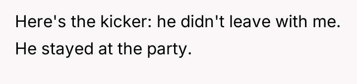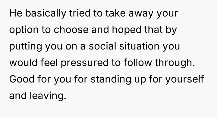 Her immediate action was to leave the situation, while the boyfriend continued to attend the event, creating a fundamental conflict between her need for safety and respect and his actions which disregarded her boundaries.