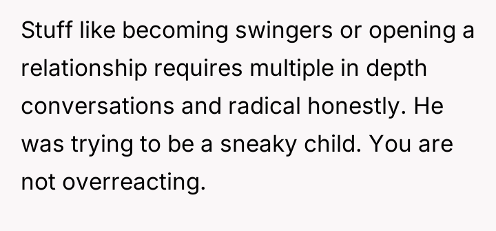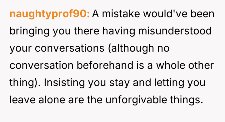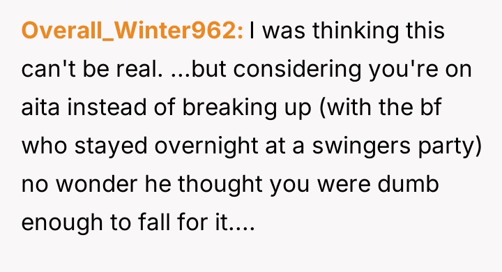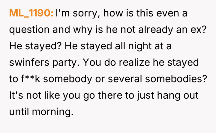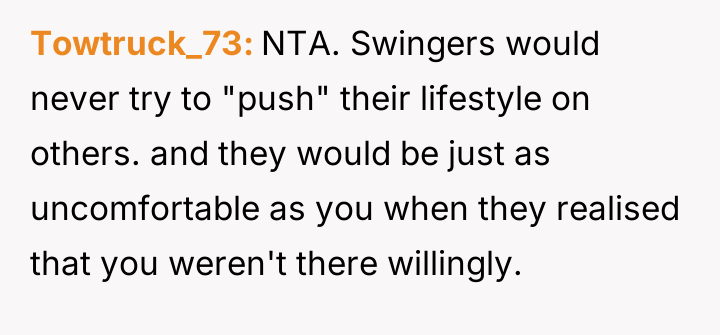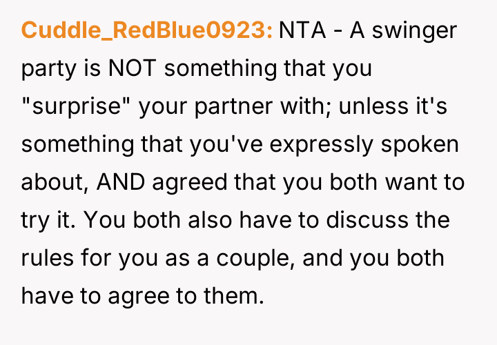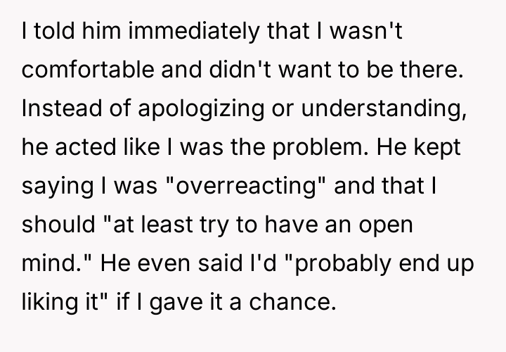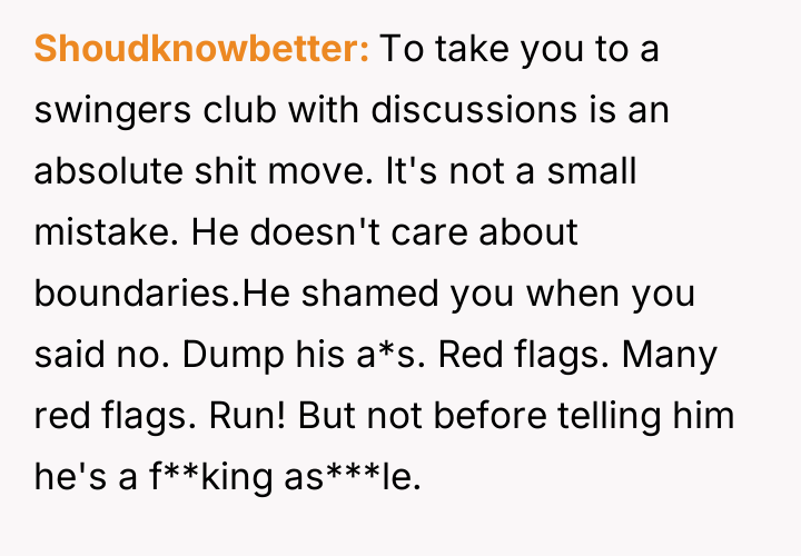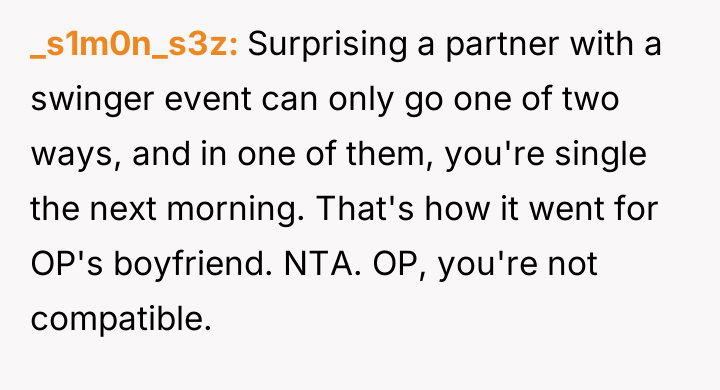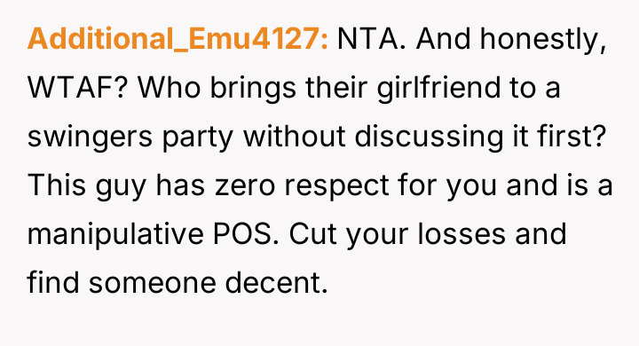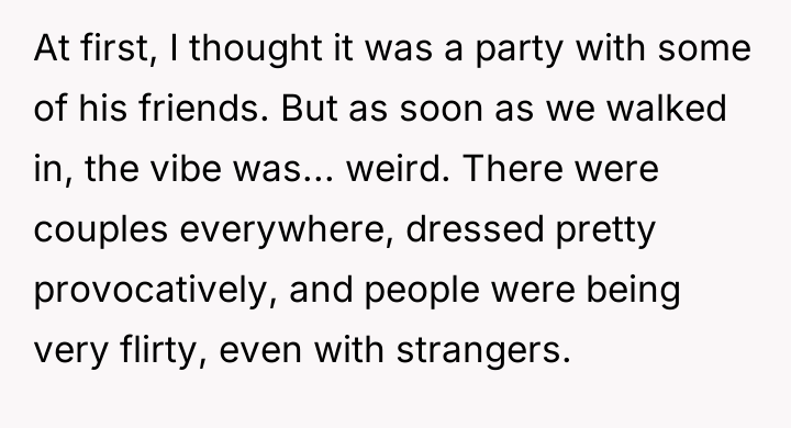 The original poster (OP) experienced a significant breach of trust when her boyfriend planned and took her to a swinger party without her explicit consent, leading to feelings of shock, disrespect, and being blindsided.