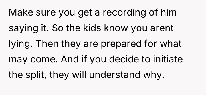 Her reaction was to use a threat against their adult children as a defense mechanism against the potential pain of divorce stemming from his statement.